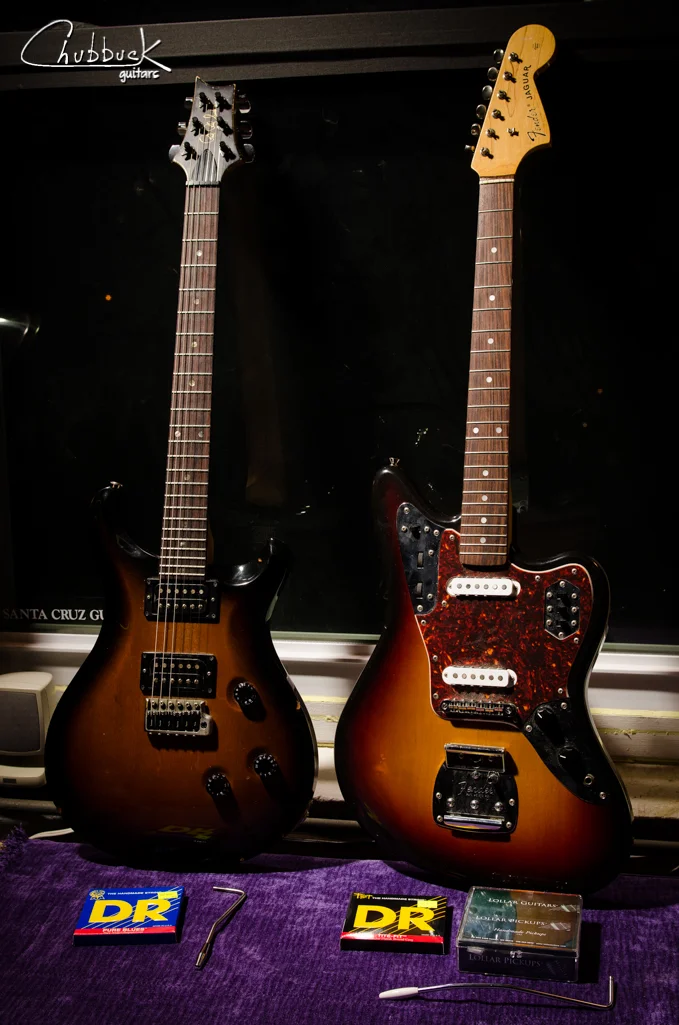 PRS McCarty & Fender Jaguar on the bench for setups. The Jag is getting new Lollar Pickups.