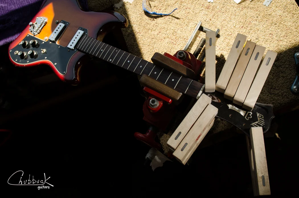 Late 1960’s Guild S-100 Polara with a built-in stand!Edit:  I was mistaken, this is a S-100 Polara, not a S-200 Thunderbird.  The Thunderbird has a slightly different body shape, Jaguar-style switches and block fingerboard inlays.  Th…