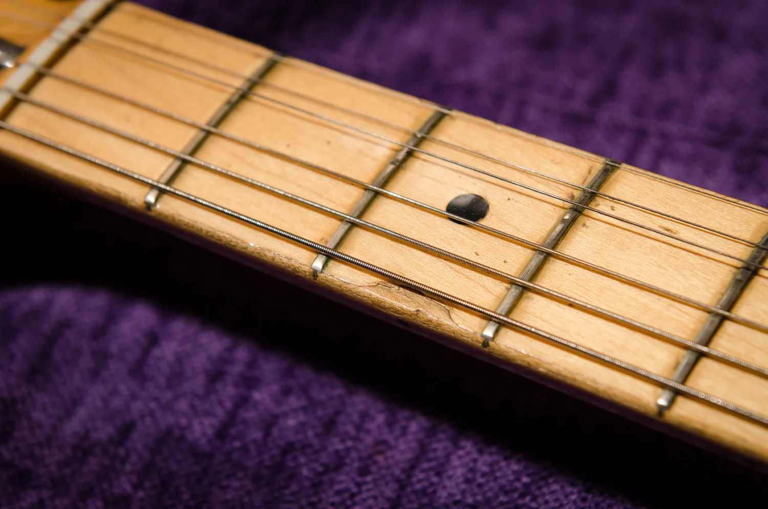 The original frets are installed pre-finish, so there is a thick polyester web that seals the frets in. This web needs to be completely cut-through in order to prevent damage to the surrounding fingerboard finish. This is a long and meticulous process to ensure each fret is fully disconnected from the fingerboard finish prior to removal. Another trick is to tighten the truss rod before removing the frets. This springs opens the fret slots slightly to help minimize chip-out.